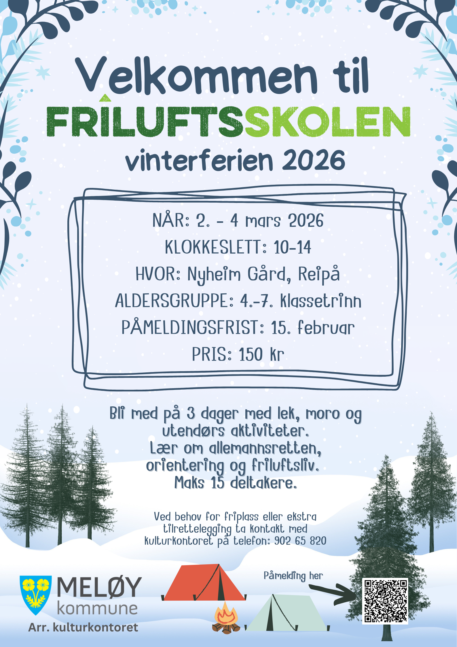 Har du spørsmål eller behov for friplass eller tilrettelegging, kontakt kulturkonsulent Silje Karlsen på karsil@meloy.kommune.no, tlf. 902 65 820