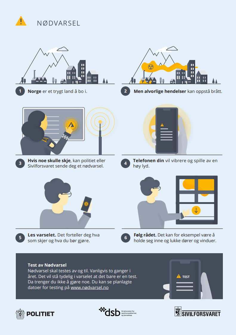 Nødvarsel på mobil testes til hele befolkningen både for å gjøre befolkningen kjent med hvordan det oppleves å få et Nødvarsel og for å sikre at systemet fungerer som det skal.