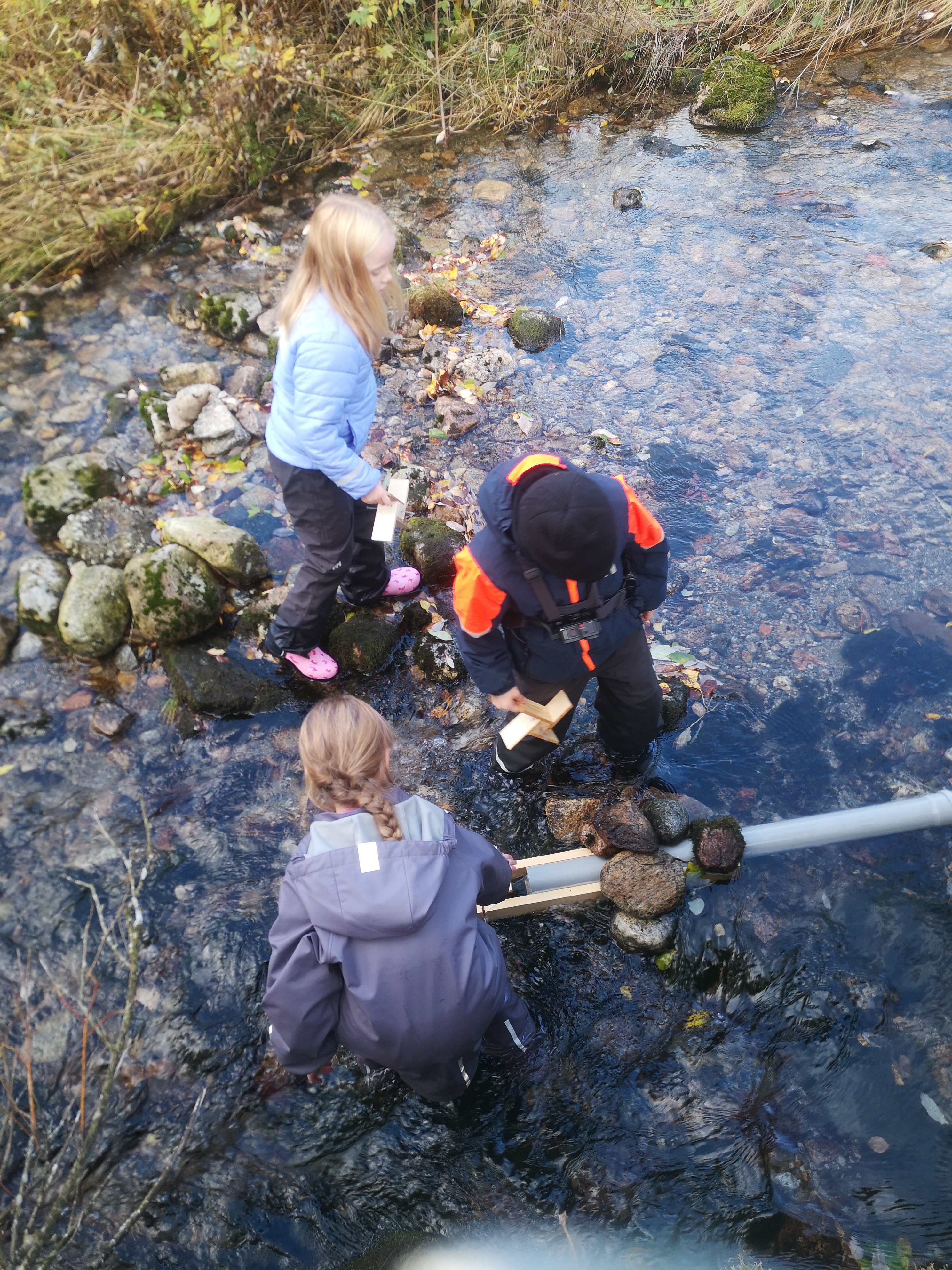 Gruppene samarbeider om å sette opp stativ til vannhjulene i bekken.